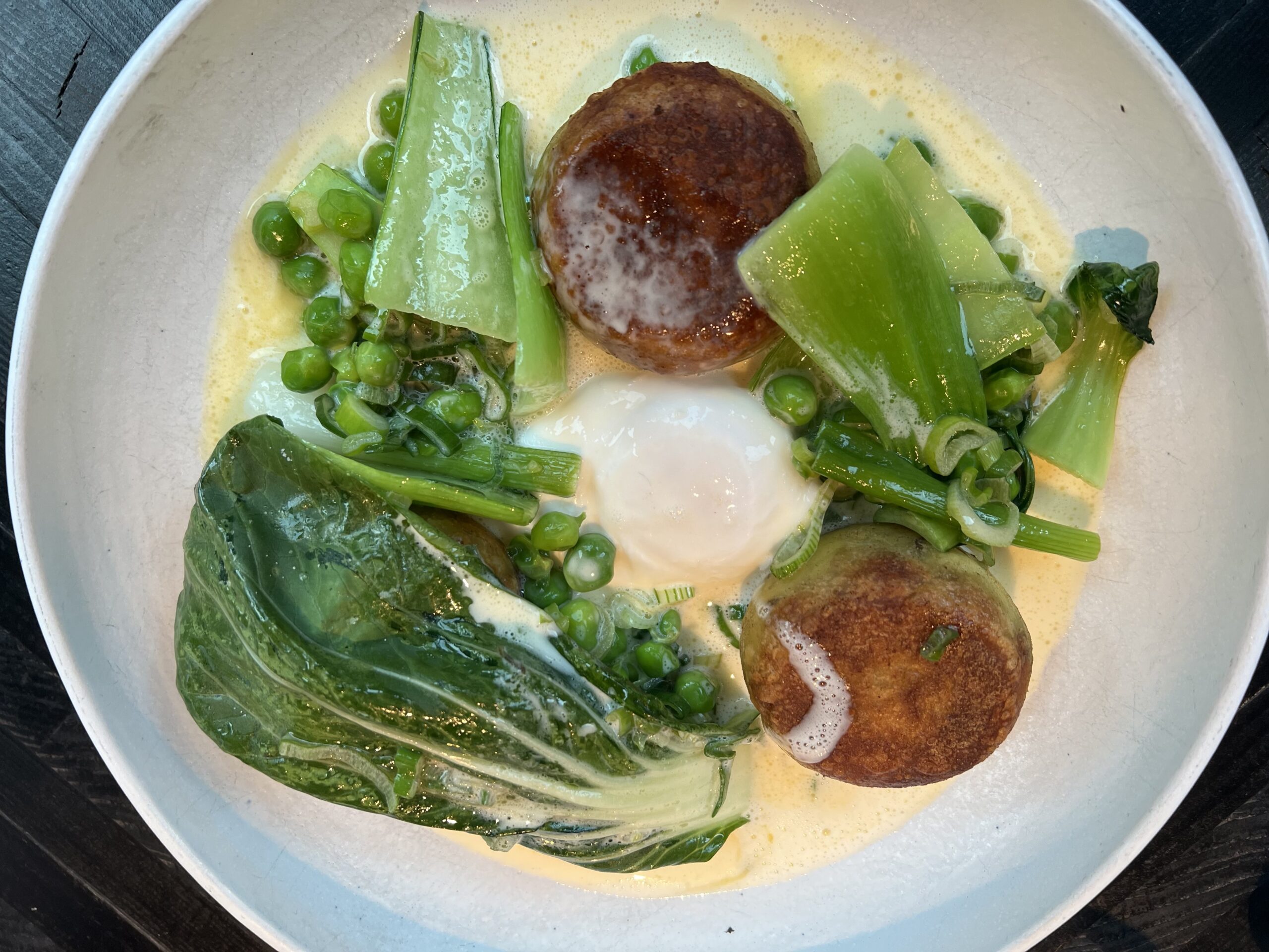 Jag är servitrisen för evigt tacksam för att hon påpekade att kroppkakorna är glutenfria. Under tidigare besök på Freyja har jag tvärtom fått höra att jag som glutenkänslig inte kan äta dem. Kroppkakorna var de godaste kroppkakor jag har ätit i hela mitt liv! Dessutom var de snygga. Vackra dumplings får ändå ses som ett stordåd. Smak, arom, konsistens, fyllning, estetik – Freyjas kroppkakor får maxpoäng i alla grenar. Kroppkakorna var kvällens höjdpunkt för mig!