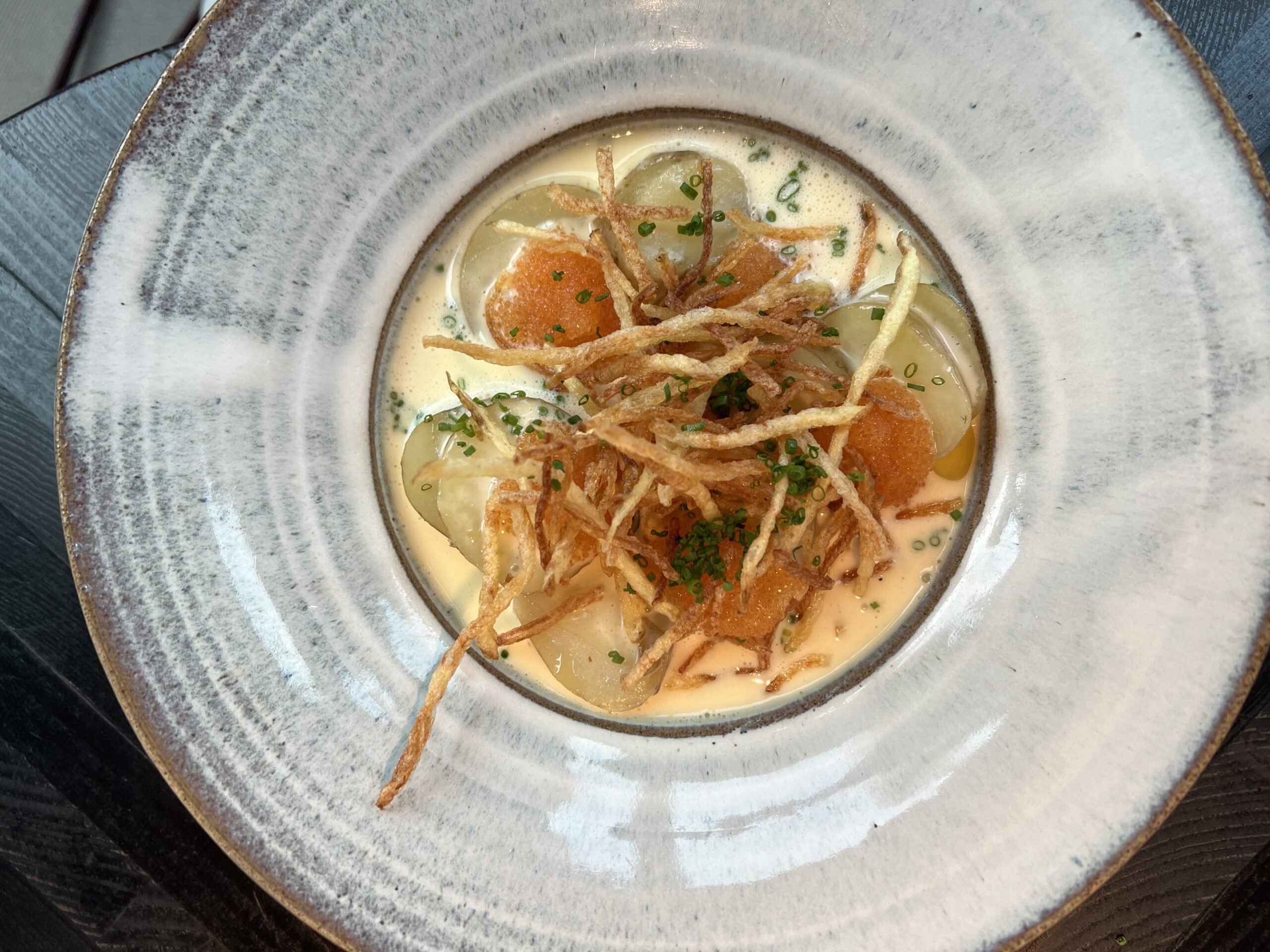 Så var rödingen med sandefjordssås: både inledningen, mellanspelet och finalen smakade fadd grädde. Hade det funnits något annat att hämta i smakkompositionen hade jag kanske stått ut med fiskens geléklumpsaktiga konsistens men nu blev även den en tröskel jag inte kunde förmå mig att kravla över.