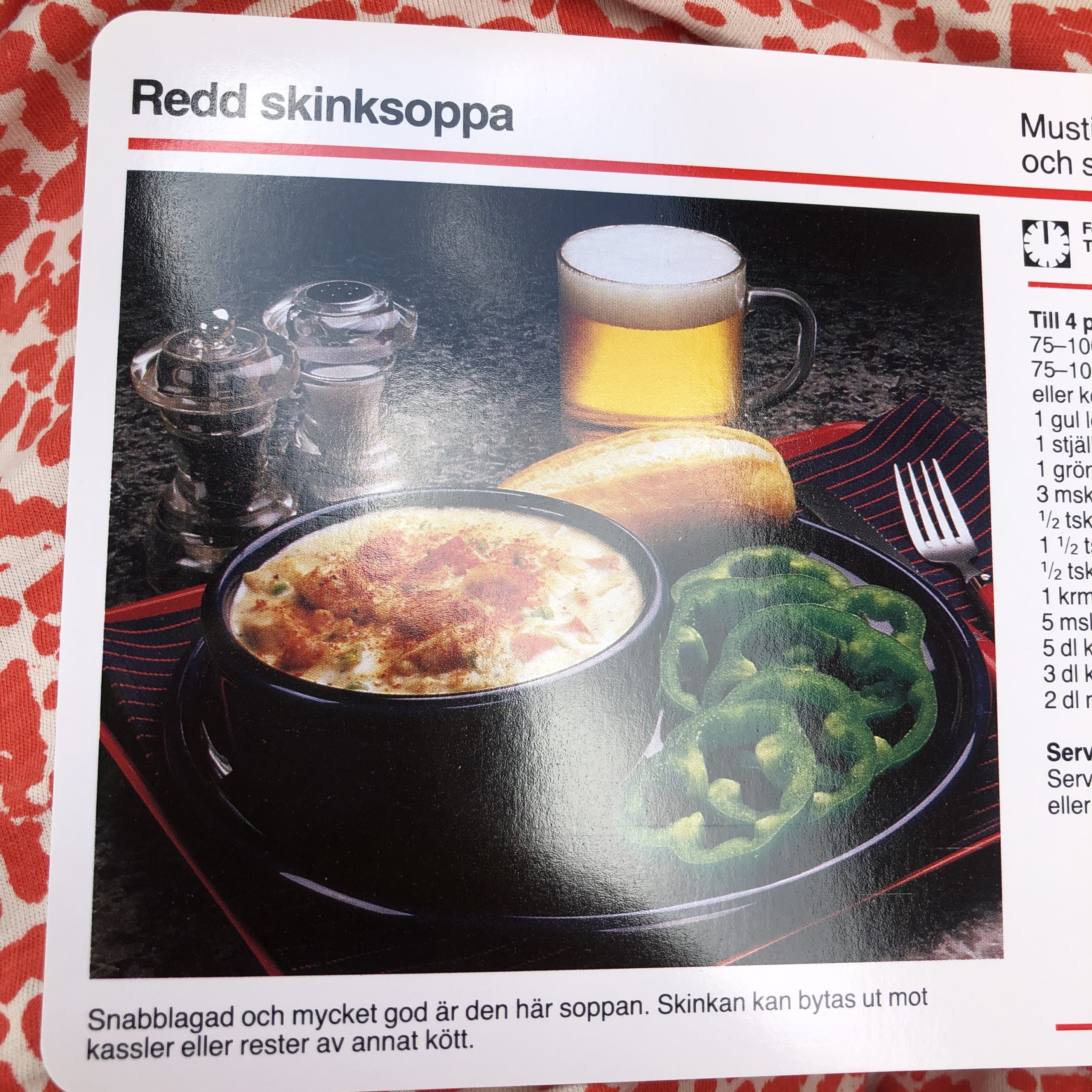 ”Snabblagad och mycket god är den här soppan. Skinkan kan bytas ut mot kassler eller rester av annat kött.”