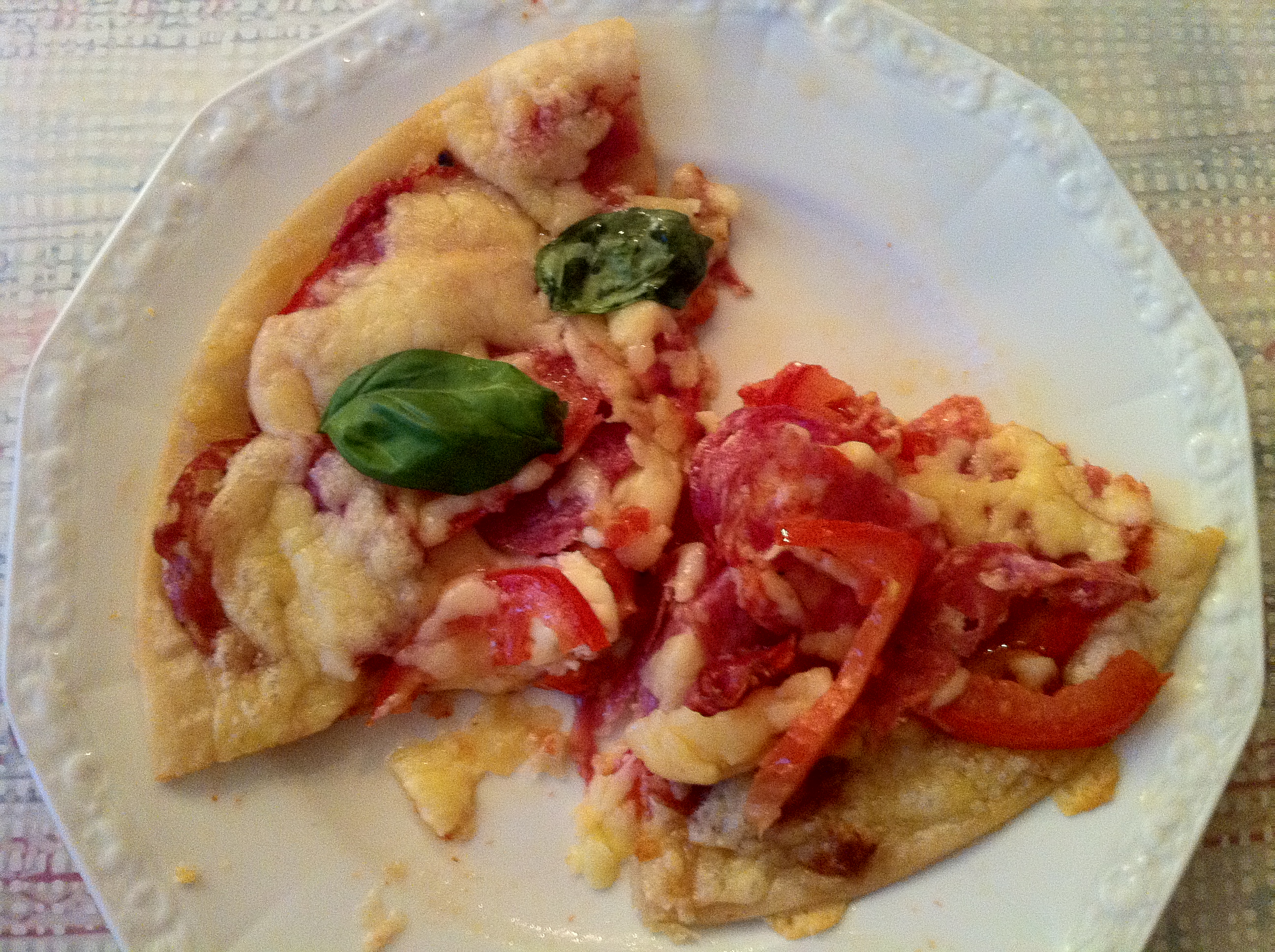 Plötsligt händer det. På tips av min veteallergiska kompis Sanna köpte jag idag färdigpizza från Schär. Sanna tipsade om att pimpa Margerita, men jag ryckte en korvpizza och pimpade den med tryffelsalami, tomat, prästost och basilika.