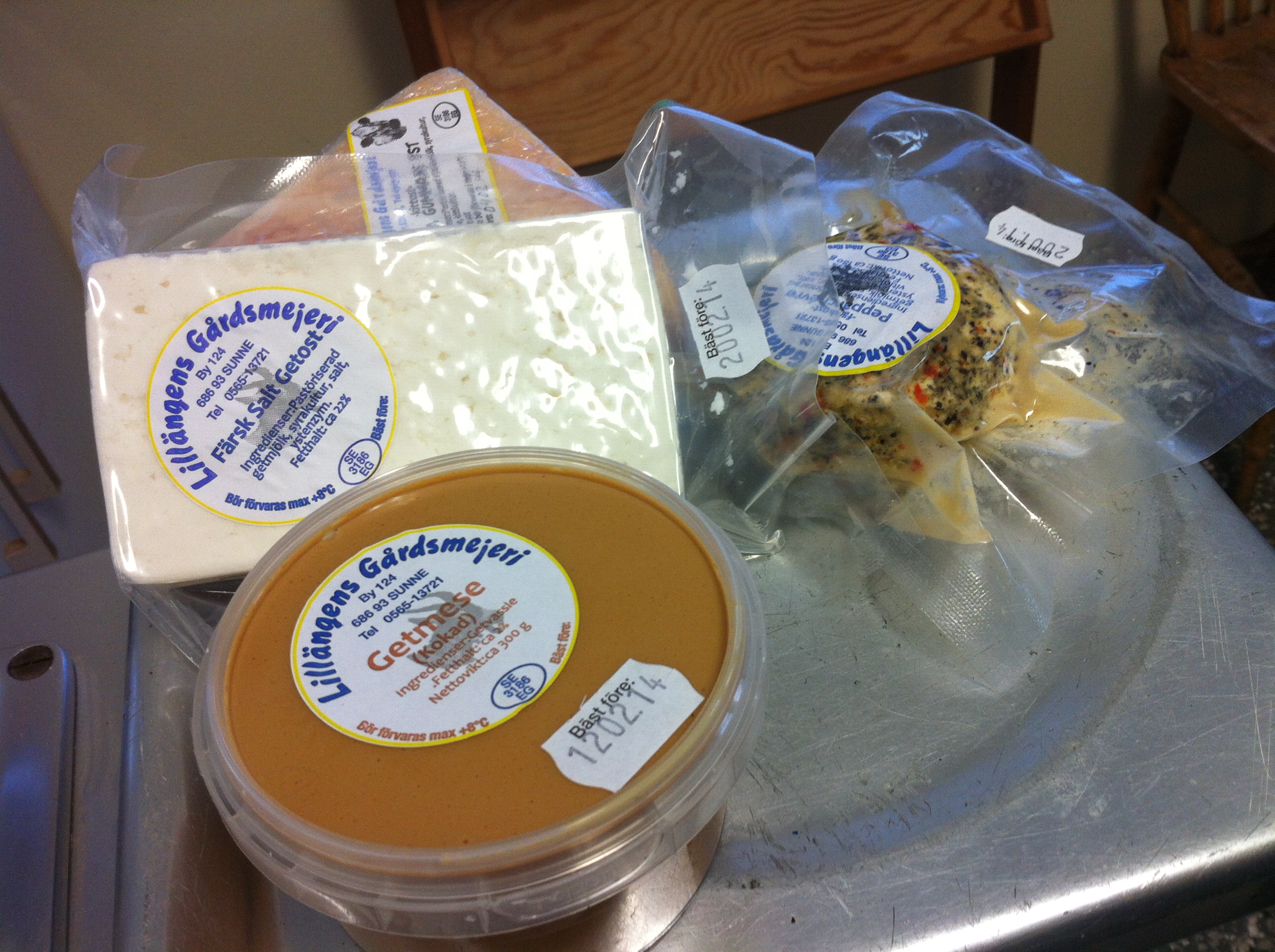 I helgen var jag i Sunne och hittade till Lillängens Gårdsmejeri. Getost är laktosfri och alla sorter kostade 215 kr/kg här, så jag kom hem med närmare kilot av blandade ostar. Getmese, saltad färsk, pepparchèvre och en röd kittost.