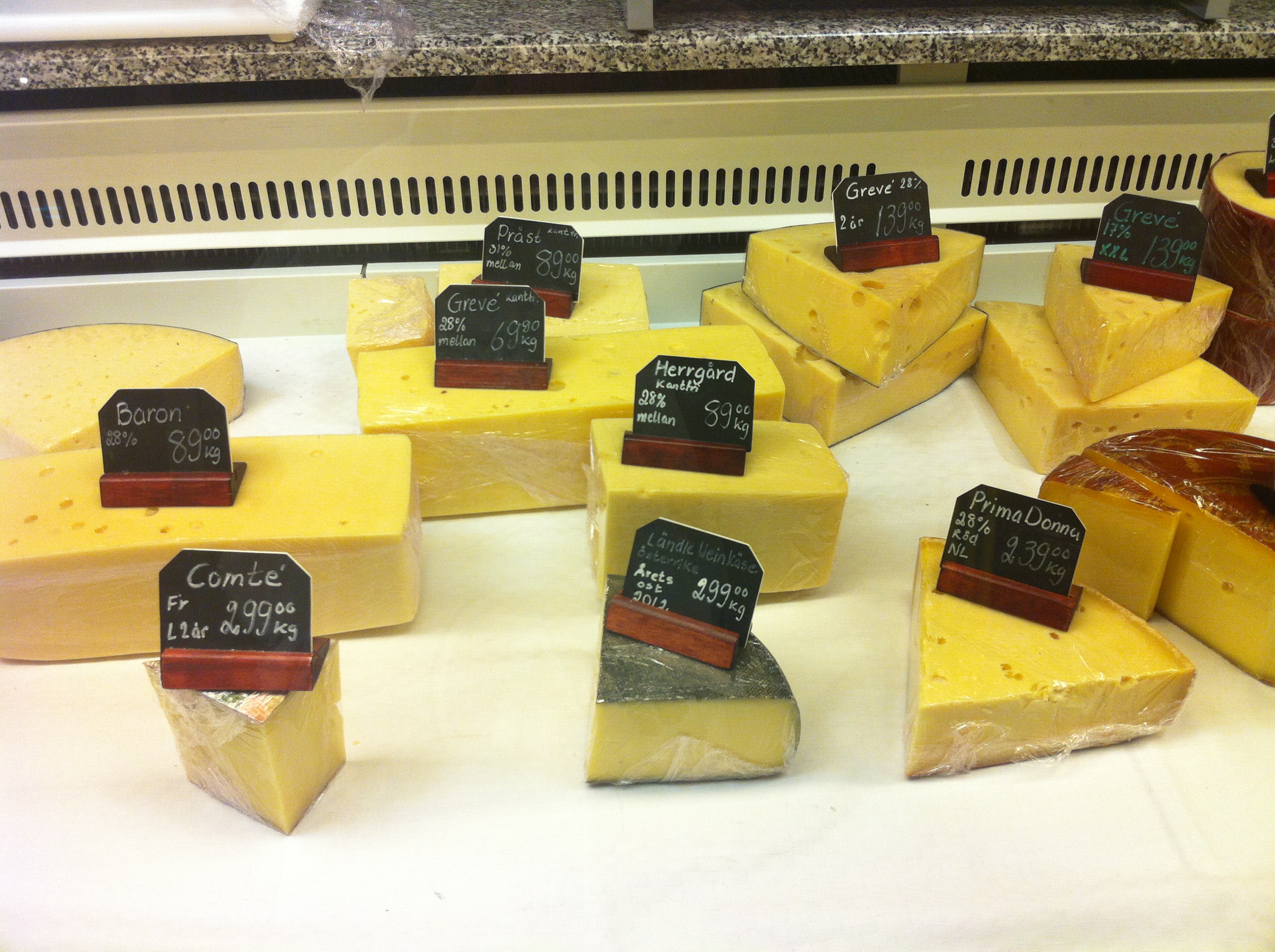 Jag ska aldrig mer säga något taskigt om NK. Måhända att deras idéer är på många sätt gammeldags (och då menar jag inte klassiska utan just gammeldags), men när det innebär att det finns tre sorters racletteost i ostdisken är ingen gladare än jag! Raclette Berghof är en grottlagrad ost på komjölk, Raclette Fumée är rökt och Raclette de Chèvre är gjord på getmjölk. Samtliga är halvhårda.
