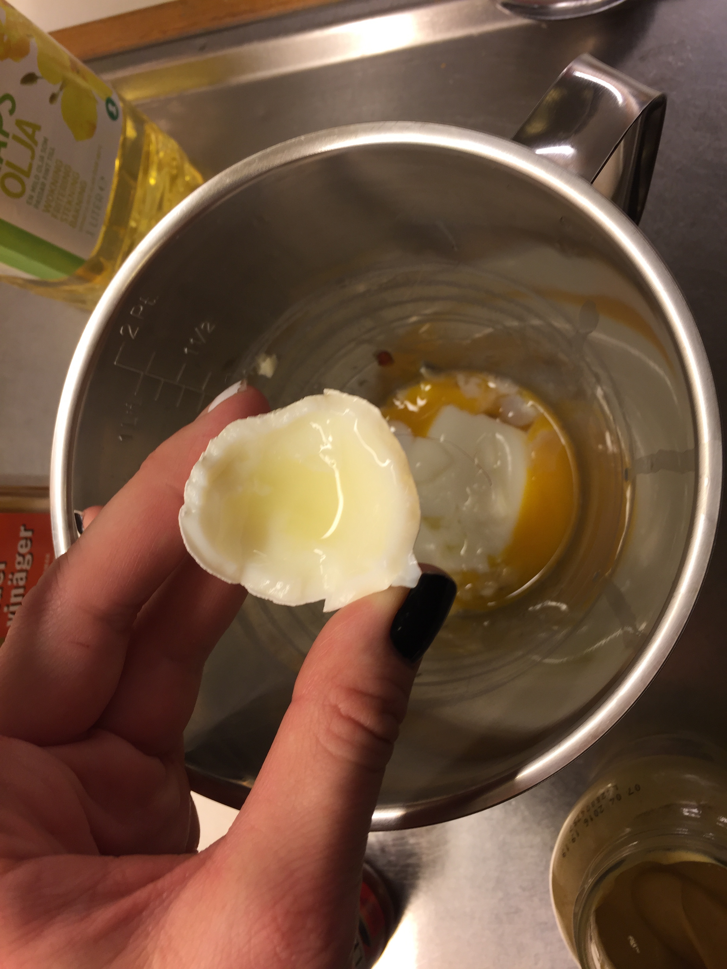 Lägg vitlök, senap, citron/vinäger i en skål. Knäck ägget med vass kniv + bryt isär, gröp ur med sked.