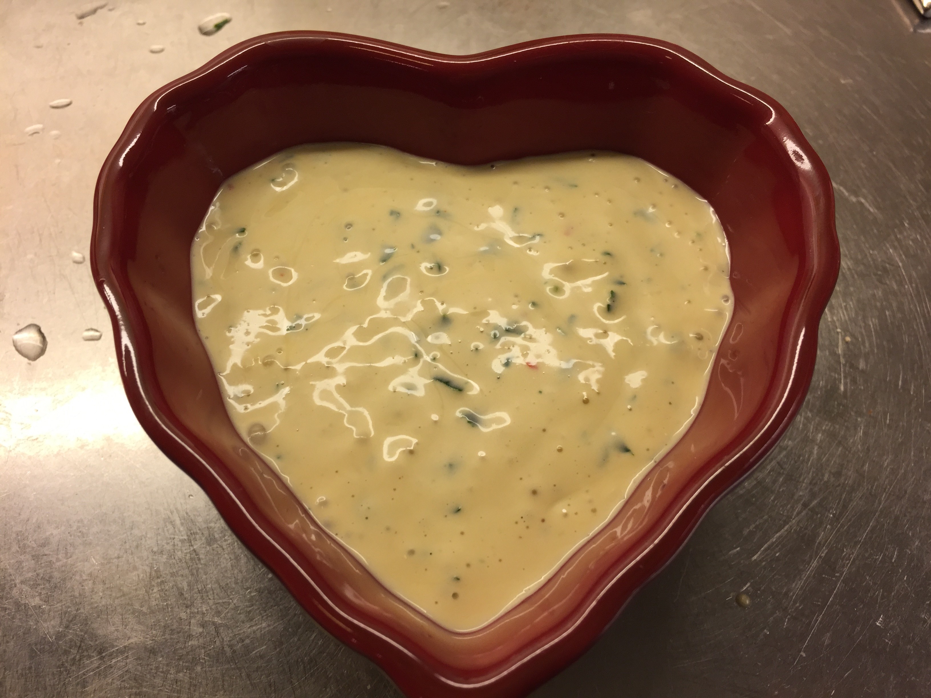 Fyll på med olja, i små skvättar. Mixa tills du får önskad konsistens. Smaka av – mer salt, citron, hetta? Till sist – mixa ner kryddgrönt (jag har bladpersilja i dressingen på bilden). Blir såsen för tjock? Tunna ut med lite mjölk eller vatten. För tunn? Mer olja.