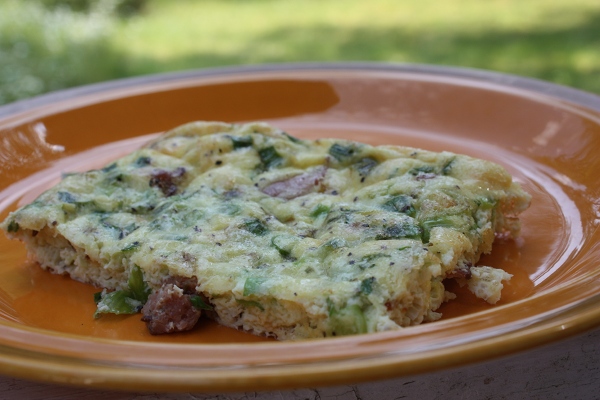 Omeletten på bilden innehåller salladslök, två sorters grillkorv och ett gammalt bacon. Smeten är gjord på 5 ägg, 1,5 msk vatten, 1 dutt salt samt några vrid på kvarnen med vit- och svartpeppar. Den räckte till två medelhungriga personer.